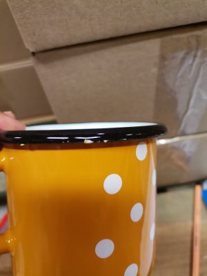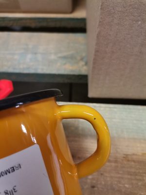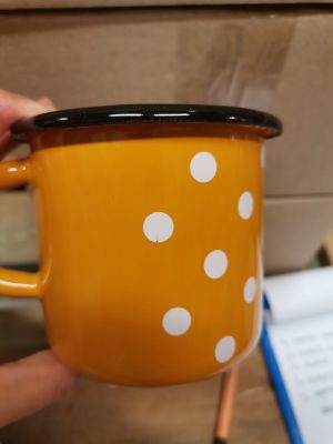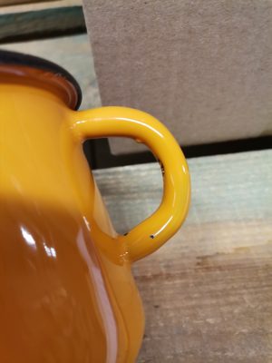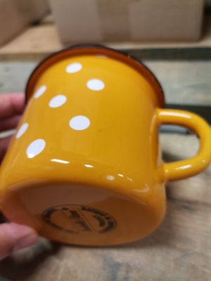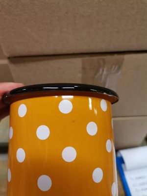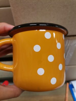 Emajliran lonček v mustard – rumeni barvi z belimi pikami je narejen v Evropi, bolj natančno na podeželju, kjer stara tradicija izdelave emajla sreča naše vintage in Polka dot – pikčaste motive.