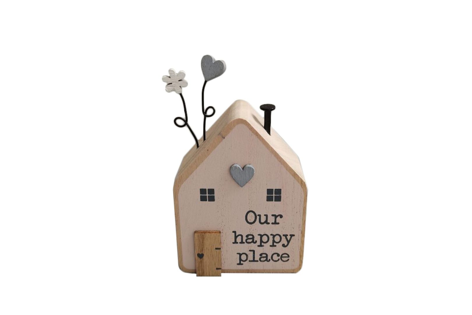 Prisrčna lesena hiša z napisom “Our happy place”.