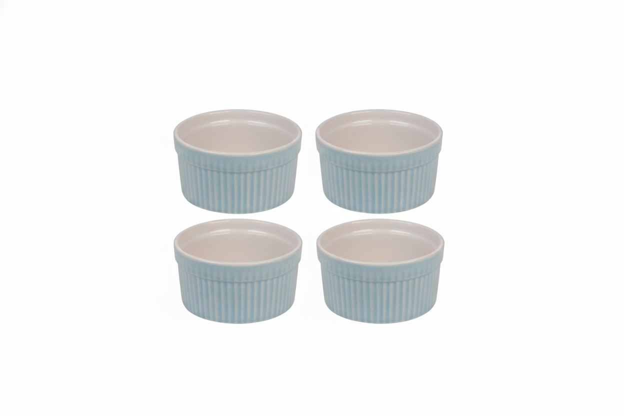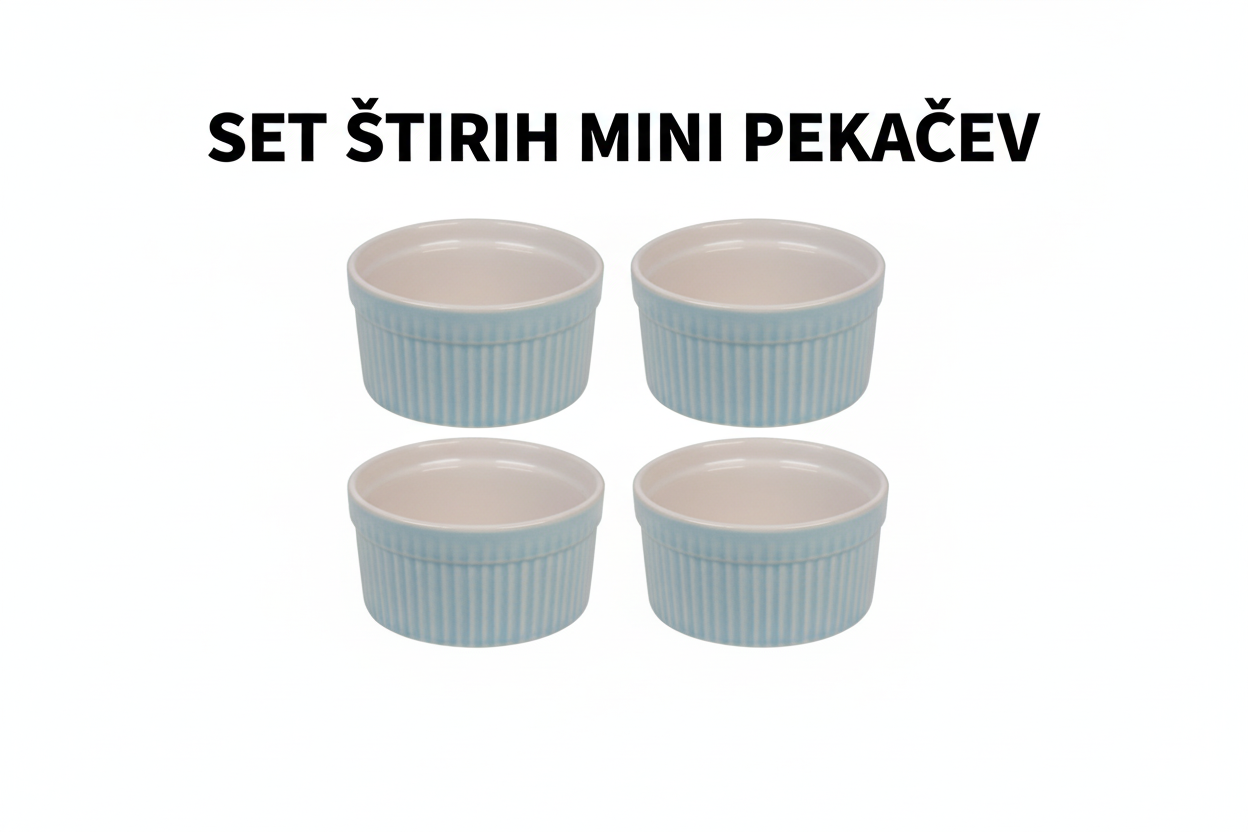 Mini pekač v modri barvi z izbočenimi črtami. Odličen za pripravo muffinov ali souffléja. Primeren za peko v pečici ali mikrovalovni pečici in za čiščenje v pralnem stroju.