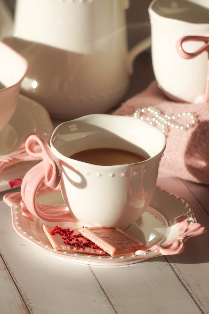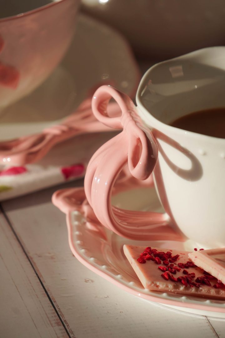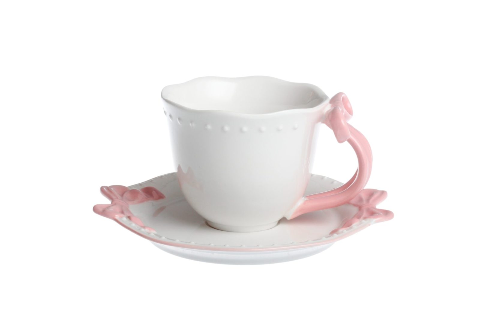 Skodelica s krožnikom v beli barvi z roza pentljo – Ribbon Grace.